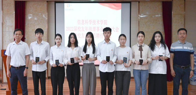 会议开始,由曲智强老师宣读了2022届校友信息员聘任文件。学院2022届校友年级理事会筹委会代表国芸祯介绍年级理事会的筹备情况。根据学生自愿报名,经团委推荐,学院聘任丁一晟为会长,国芸祯为秘书长,58名同学为信息员。大会一致同意通过此项决议,刘国柱、王军老师为2022届校友信息员代表颁发证书、徽章。